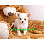 | Super delicado e lindo filhotinho macho de chihuahua de pelo longo na cor branco com mascara dourada.